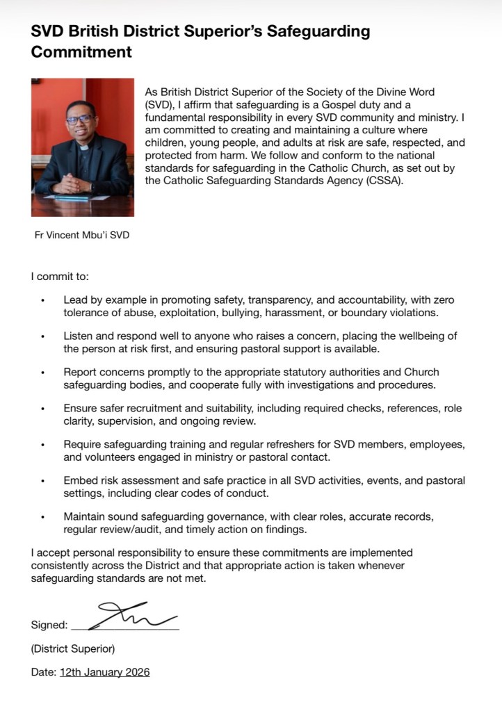 January 12, 2026 IBP - Irish British Province / Safeguarding SVD British District Superior’s Safeguarding Commitment Posted by SVD IBP District commitment .pdfDownload Share this: Click to share on X (Opens in new window) X Click to share on Facebook (Opens in new window) Facebook Like Loading...